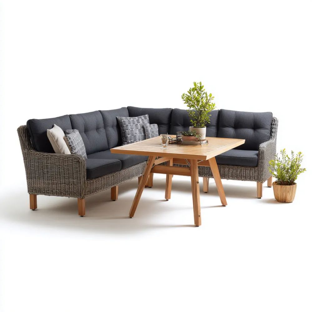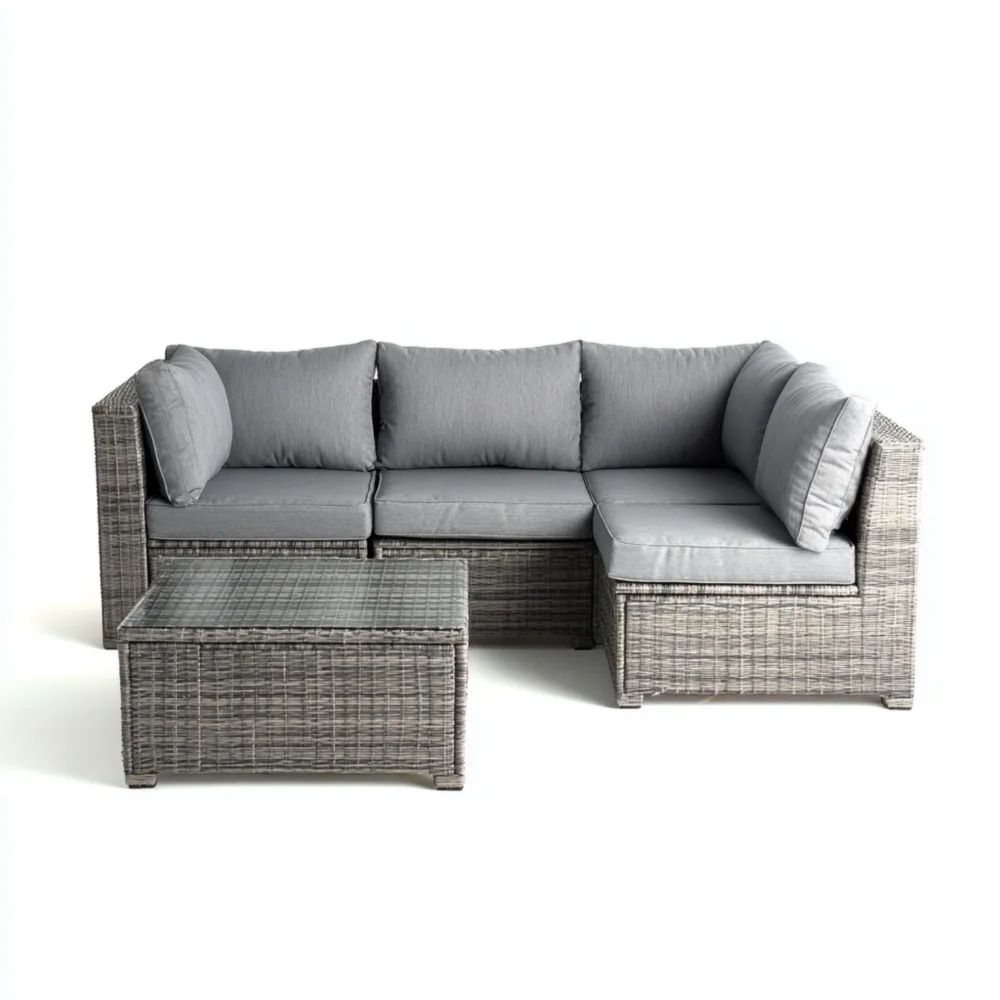 Ensemble de canapé d'angle en résine tressée 210x210x64 cm avec table 70x50x32 cm – Gris – Design moderne