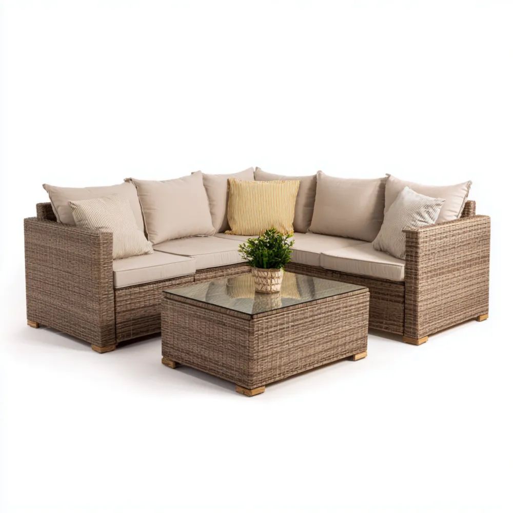 Ensemble de canapé d'angle en rotin 250x75x90 cm 5 places avec table basse 75x75x35 cm en verre – Beige – Style contemporain