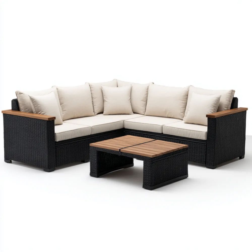 Ensemble de canapé d'angle en rotin 210x75x65 cm – Coussins Crème – Noir – Design moderne